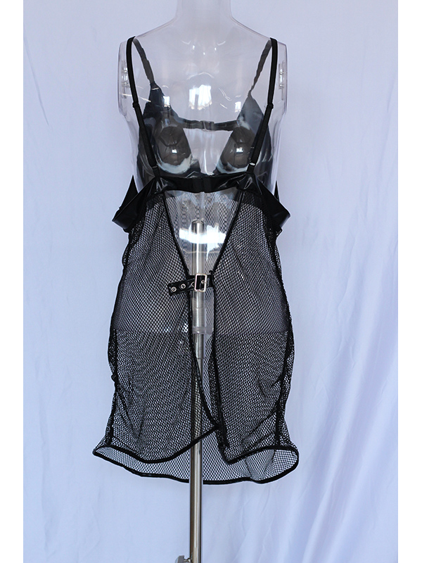 Stretch fishnet and vinyl-like microfiber babydoll with open back, buckle details and back buckle closure. Matching thong included.