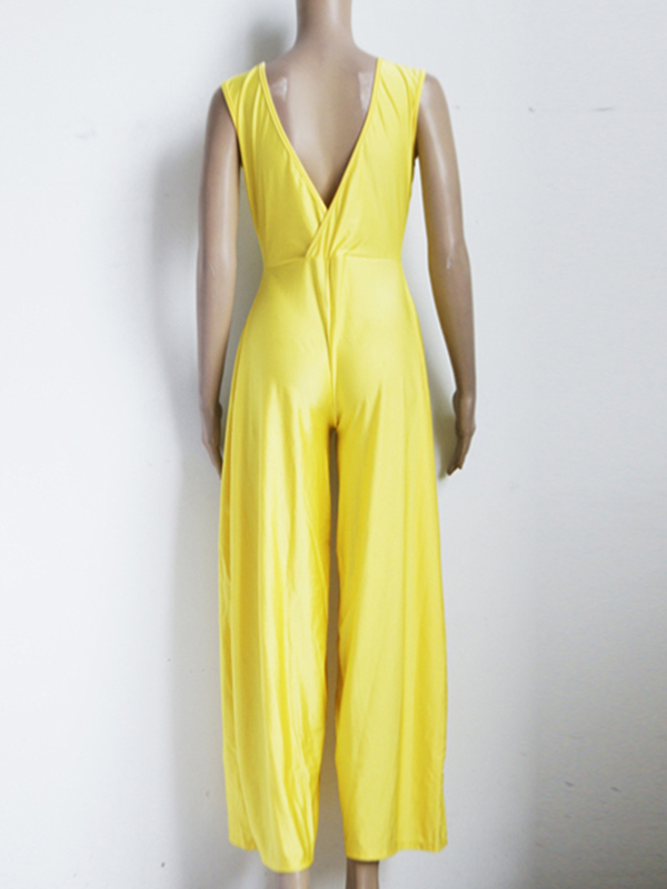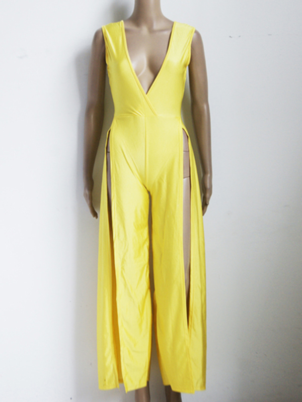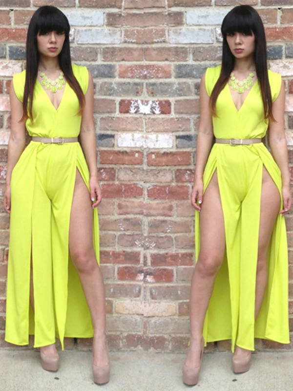 Home » Women's Dresses » Bodycon Dresses » Deep V Neck Yellow High Slit Jumpsuit