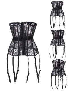 This sexy underbust boned lace corset features hollow out floral print lace, several steel boned stripes, buckle in front, tie up in back. Satin brim, garters are included. Not only fit for shaping figure, but also sexy.