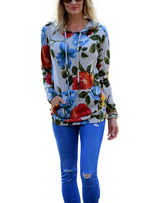 » Women Clothing » Outerwear » Sweatshirts & Hoodies » 2 Colors S-XXL Loose Fitting Floral Printed Hooded
