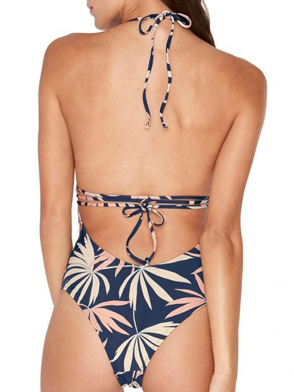 Home » Swimwear » One-Piece Swimwear » Women Polynesian Palm Print One Piece Plunge Halter Swimsuit
