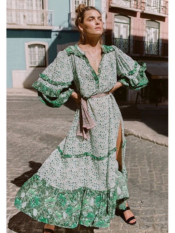 » Women's Dresses » Bohemian Dresses » Casual Stylish V Neck Long Sleeve Split Walking Maxi Dress Model Show: