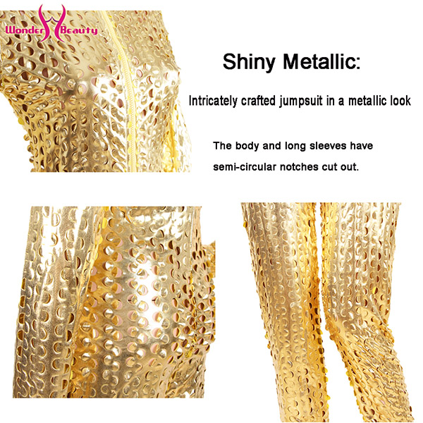 Intricately crafted jumpsuit in a metallic look. The body and three quarter length sleeves have semi-circular notches cut out.