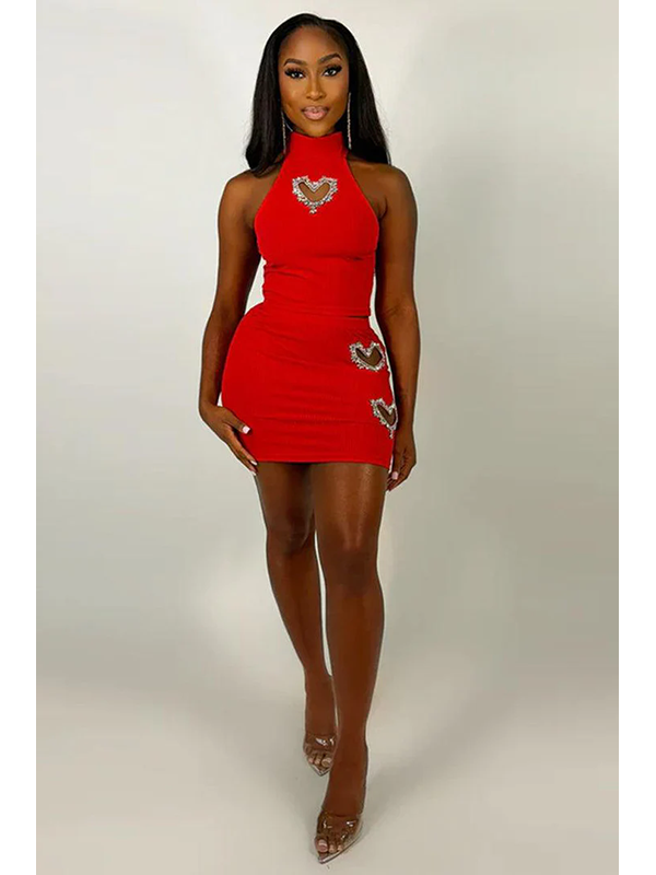 » Sexy Clubwear » Club Dresses » Women Heart Cutout Rhinestone Decor Sleeveless Top & Mini Bodycon Skirts Sets