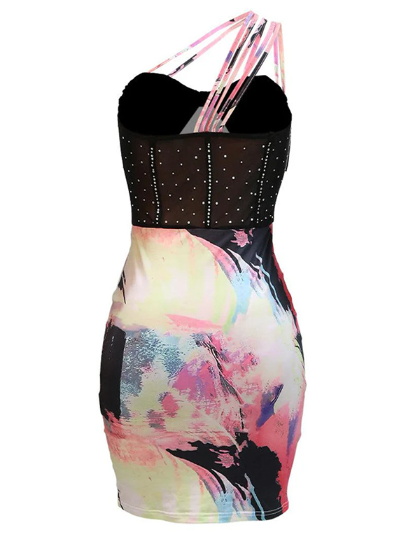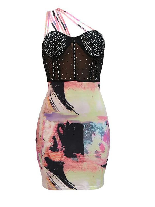 Women Rhinestones Print Patchwork Mesh See Though Dress