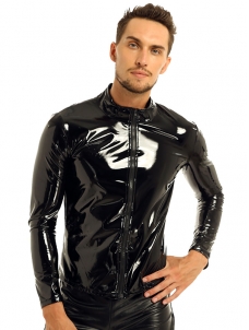 Mens Metallic Latex T-shirt Coat Wet Look Clubwear PVC Leather Zipper Shirts Club Costume Male Stree... IM037
